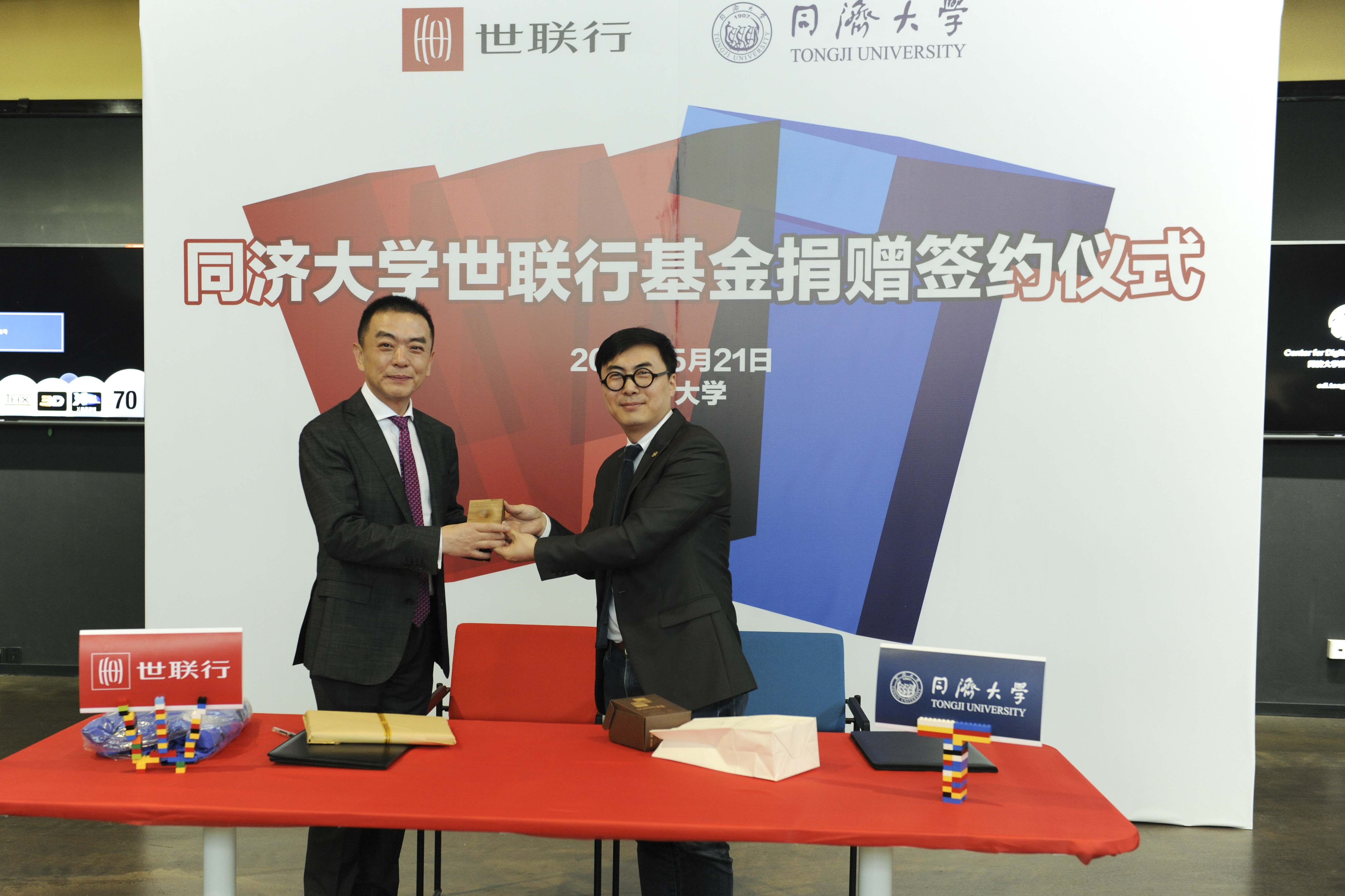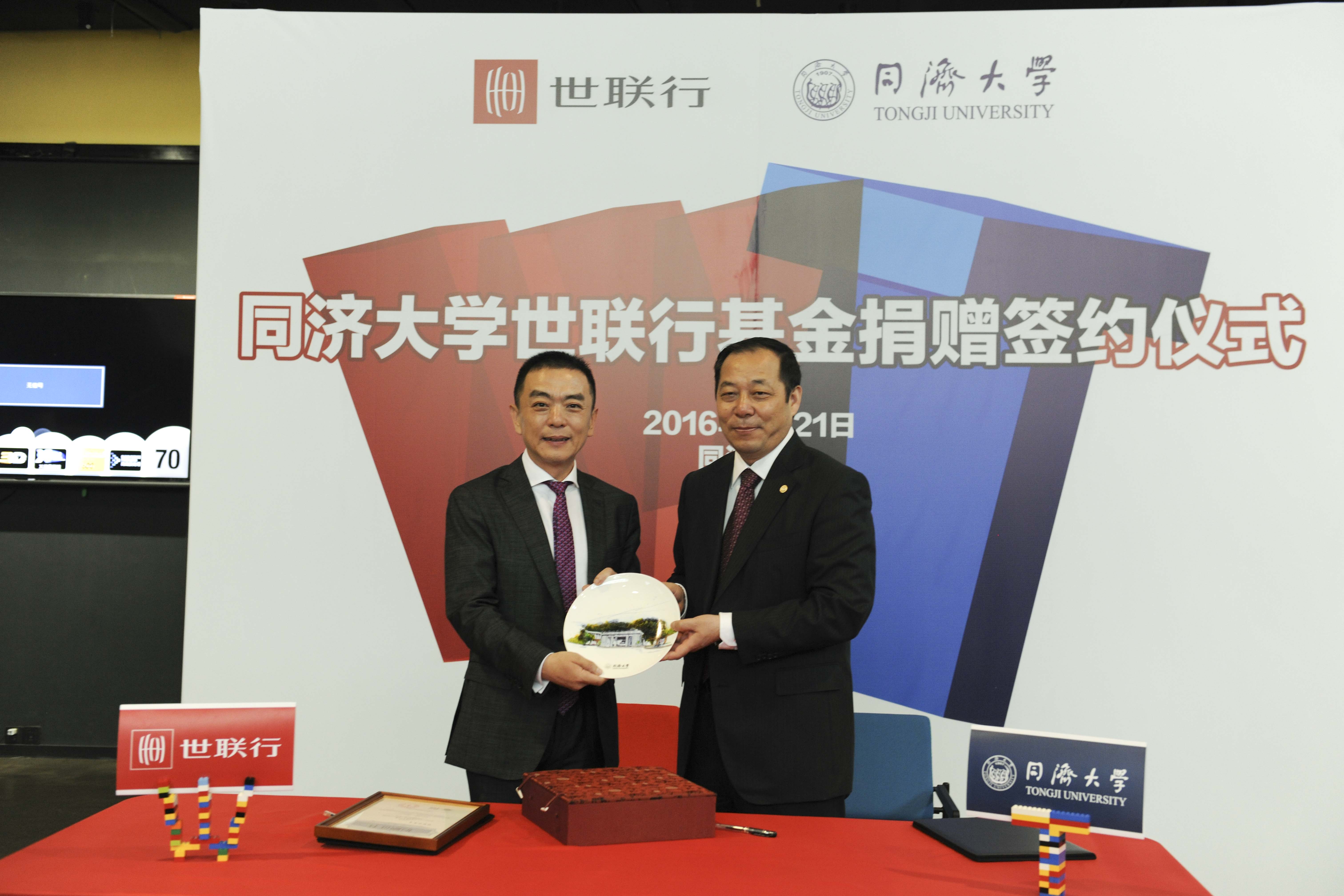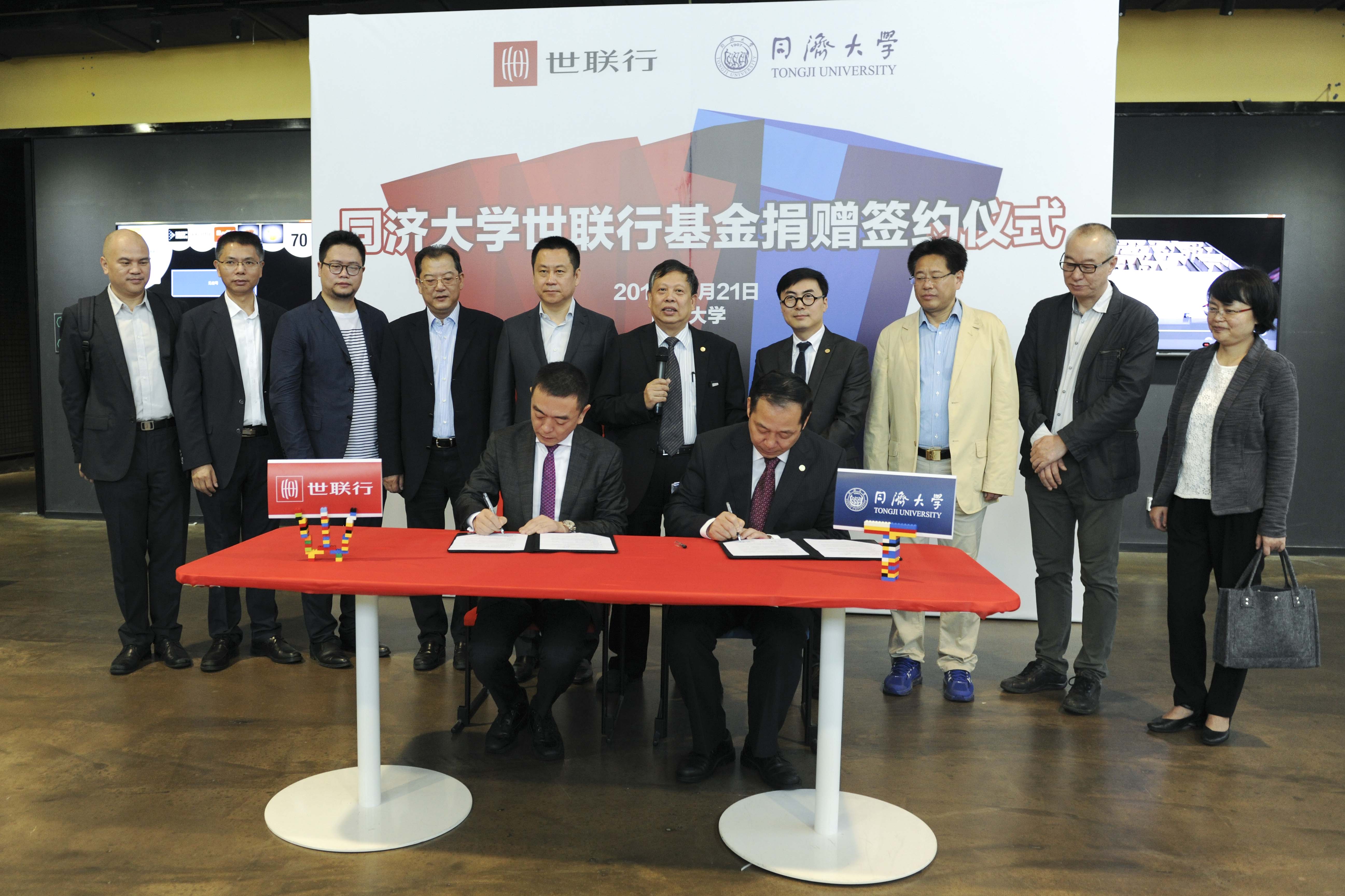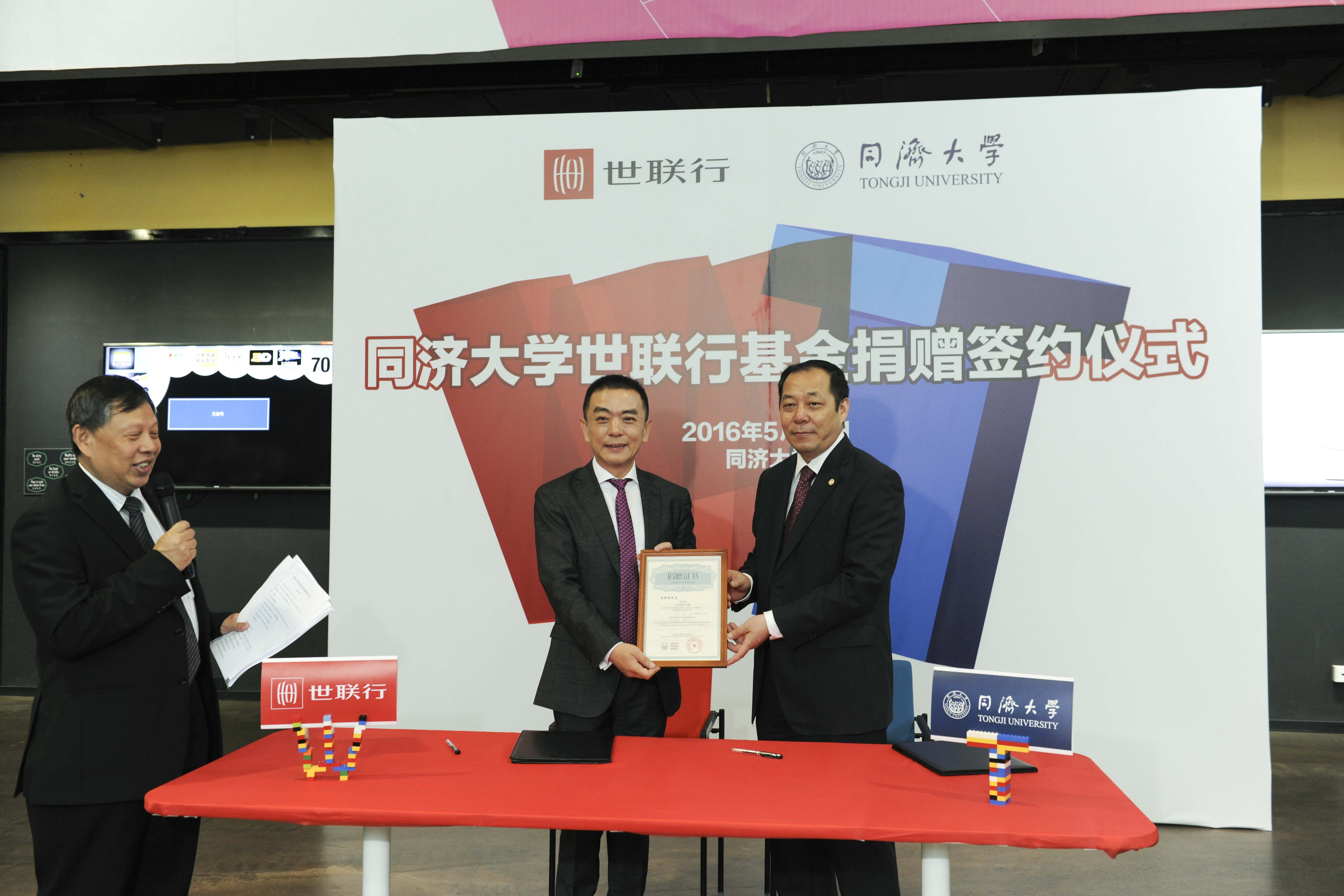 5月21日上午,“同济大学世联行基金”捐赠签约仪式在同济大学设计创意学院举行。同济大学校友、世联行董事长陈劲松个人向母校捐赠人民币贰千万元。同济大学董事、深圳市朗润投资有限公司董事长唐春山,易城股份董事长毛蔚瀛,创东方董事长肖水龙等作为捐赠方出席了仪式。同济大学党委书记杨贤金,党委办公室、研究生院、对外联络与发展办公室、设计创意学院、体育教学部等部门和院系负责人出席了捐赠仪式。同济大学常务副校长伍江主持捐赠仪式。